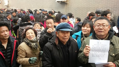 参加今天下午集访的有:上海徐汇驻京5年“三无”(无房:被枉法拍卖;无业:2010年专心、专职、专业上访至今;无劳保:上访无钱付保)王再明;徐汇颜氏家族冤案之一:颜兰英;宝山强占路地:陆雅美;医疗事故:徐佩玲;陈春芳;孙洪琴、尹国良;何秀红、谢金华、贺志美、江琴、沈兰珍、韦开珍、张雄明、周雪珍、唐秋荣、刘文荣、陆福明、徒宝霞等600余访民。