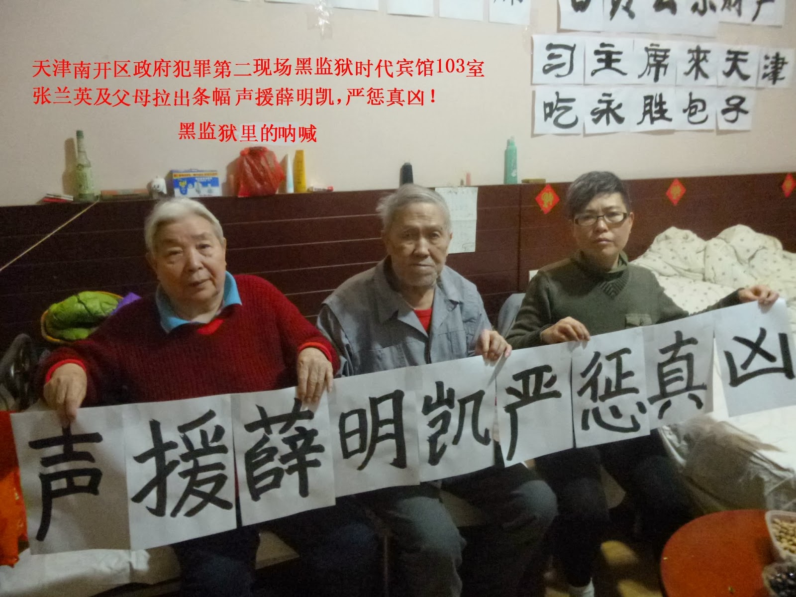 贾桂珍、张金国老夫妻俩和女儿张兰英在时代宾馆103室这间黑监狱里已经过整整两个年了,被南开区政府强抢的私有住宅至今没有归还,政府也没有要终止犯罪的迹象。到京上访的女儿张兰英,多次被绑架、被黑监狱、被逼割腕、被逼离婚。而老人为了基本的住房权利,多次抱病多次进京,天安门、中南海这些封建专制制度的象征性建筑物前早已留下耄耋老人蹒跚的足迹……