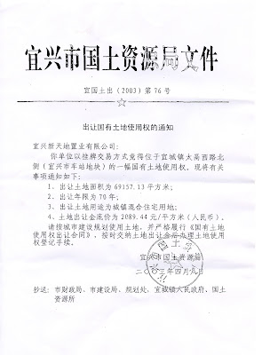 (老百姓通过《政府信息公开条例》于09年9月18日从宜兴市国土局获知,原来取得汽车站地块的国有土地使用权人是宜兴市新天地置业有限公司)