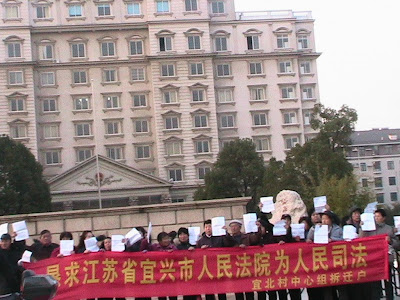 距11月9日最高法院出台“关于依法保护行政诉讼当事人诉权的意见”已经一个多月了,宜兴市汽车站居民集体诉宜兴市建设局违法发放房屋拆迁许可证的行政起诉书,也在宜兴市法院搁置近一个月了。今天上午,宜兴市汽车站居民大约50多人来到宜兴市法院,他们打出“恳请江苏省宜兴市法院为人民司法”的横幅,抗议法院有法不依,漠视老百姓“民告官”的权利。
