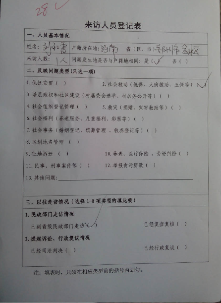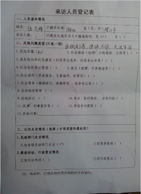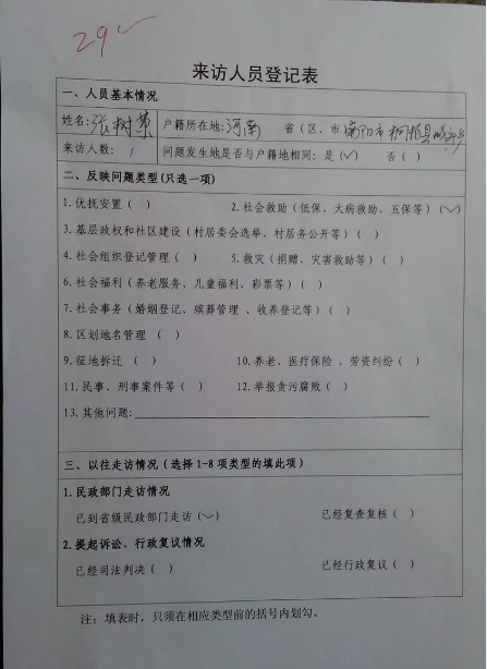 为了验证此消息,5月9日上午笔者走访民政部。此次走访民政部偶遇河南南阳张树荣、甘肃徽县侯敏玲、潜江伍立娟。除了甘肃徽县侯敏玲反映的是地震救灾重建一事外,我们三人反映的均为腐败造成的贫困问题。此次民政部开始发放了登记表,但此登记表是为了应付《无情无义的民政部》带来的官方压力。此事有登记表的纸张和格式可窥一斑:纸张为A4打印纸而不是正常的印刷表;填写格式没有具体填写反映事项的地方,可知民政部对地方官民不负责任。