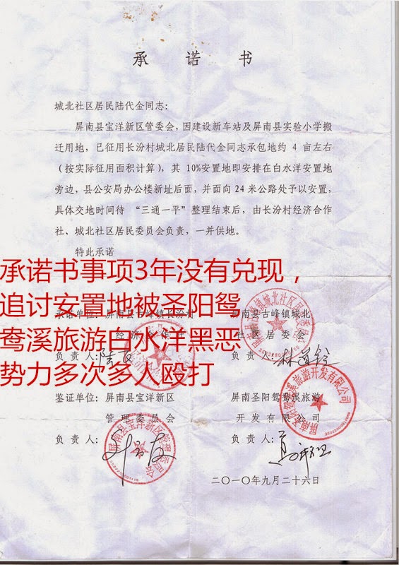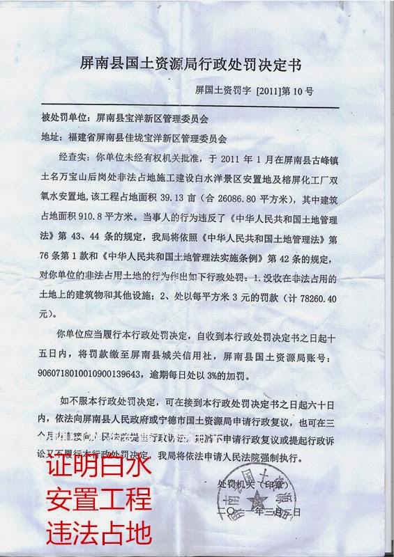据维权人士陆祚玉说,实施故意伤害暴力罪犯的头目是中共党员、屏南县鸳鸯溪旅游开发有限公司副总李学城,该犯罪嫌疑人不仅是屏南县白水洋与鸳鸯溪旅游景区负责人,还是屏南县指挥部办公室副主任兼规划征地组组长。卓凤英是陆祚玉的嫂子,全家的4亩多土地被屏南政府宝洋开发区、圣阳鸳鸯溪旅游开发有限公司强占。2011111日,屏南县国土资源局接到举报后,作出屏国土资字【2011】第10号违法用的通知书与行政处罚决定书,责令屏南县白水洋与鸳鸯溪旅游景区停止施工。