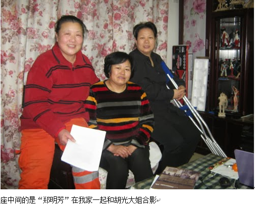 春节来临,郑明芳哭诉着说因经济困难,来北京时手机不能用,是中国著名维权人士胡佳(权利运动注:胡佳明确表示自己不了解郑)给她买的手机,过年也没有地方去。当地国保在追杀她,一旦被抓回去就坐牢了,她的房子就被政府强拆,就这样又留下她在我家里一起过年。