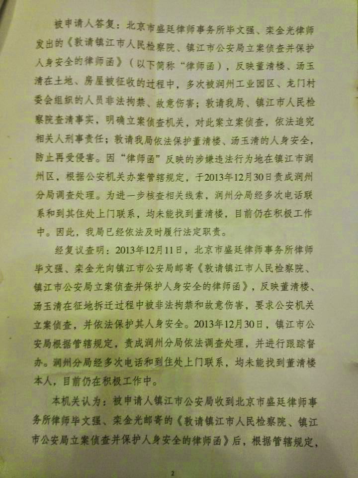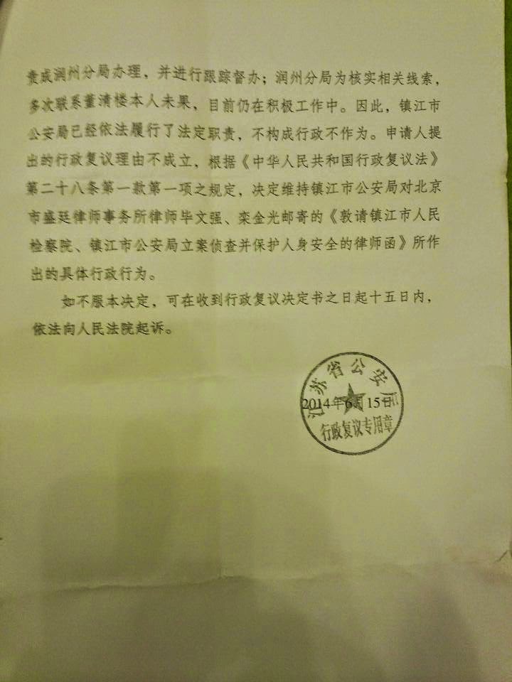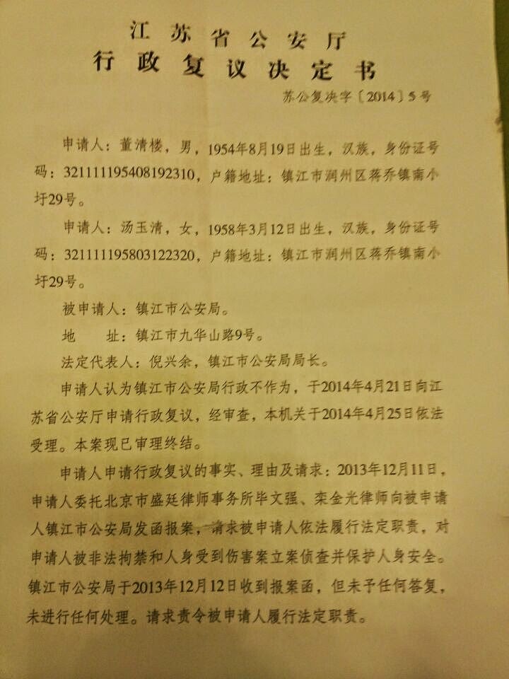 江苏省收到董清楼的行政复议申请后,于615日作出(2014)苏公复决5号《行政复议决定书》,称镇江市公安局已经责令董清楼户籍所在的润州区公安分局履行保护其生命财产安全职责,但多次联系找不到董清楼、汤玉清夫妇本人,所以认定镇江市公安局不存在不作为行为。