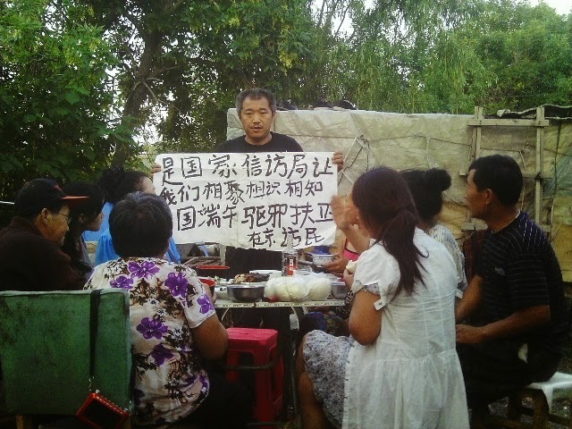 农历五月初五端午节,在京的天津唐新波、吉林常洪艳、黑龙江郝淑娥、孙波、深圳何观娇、辽宁郝志全和母亲闵玉琴、内蒙古通辽巴玉环、以及无籍的陈忠老人等,相聚北京上访村,共度端午节,祝贪官死光光。