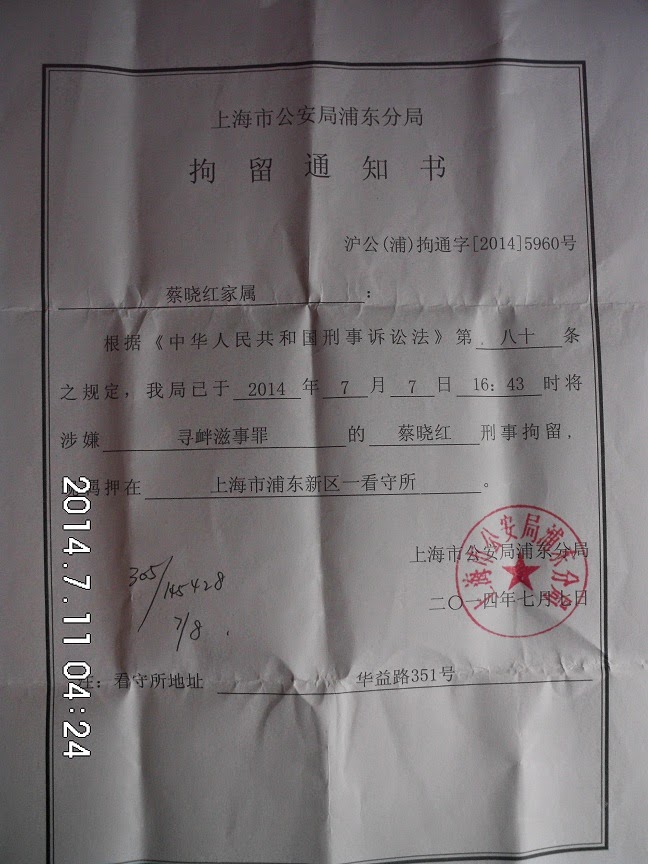由于家中只有老母亲,外界才获知上海浦东新区蓸路镇的农民蔡小红于7月7日被浦东公安分局以“寻衅滋事”刑拘的消息。据悉,蔡小红家的土地与房屋在2002年就遭到党和政府的掠夺,至今未得到分文补偿。为了追索自己的房屋,蔡小红“理所当然”住进了建在自己土地上的安置房。