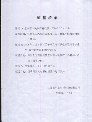 在庭审前的答辩状和交换证据过程中,匪夷所思的事情发生了,一个名叫江苏省华东石材有限公司,自称“2009.8.25行政执法”行动是他们组织干的。这个公司并以“行政诉讼”第三人的身份对原告李俊海的行政诉讼提交了答辩状。在答辩状中这个公司甚至称“万石镇依法取缔非法生产经营行为领导小组”是他们组织成立的“组织”。 今天一个有限公司竟然可以专门成立一个组织,去对另一个平等民事主体的经营活动进行“取缔”甚至“行政执法”,不知道这算不算是社会主义依法治国的法治特色?