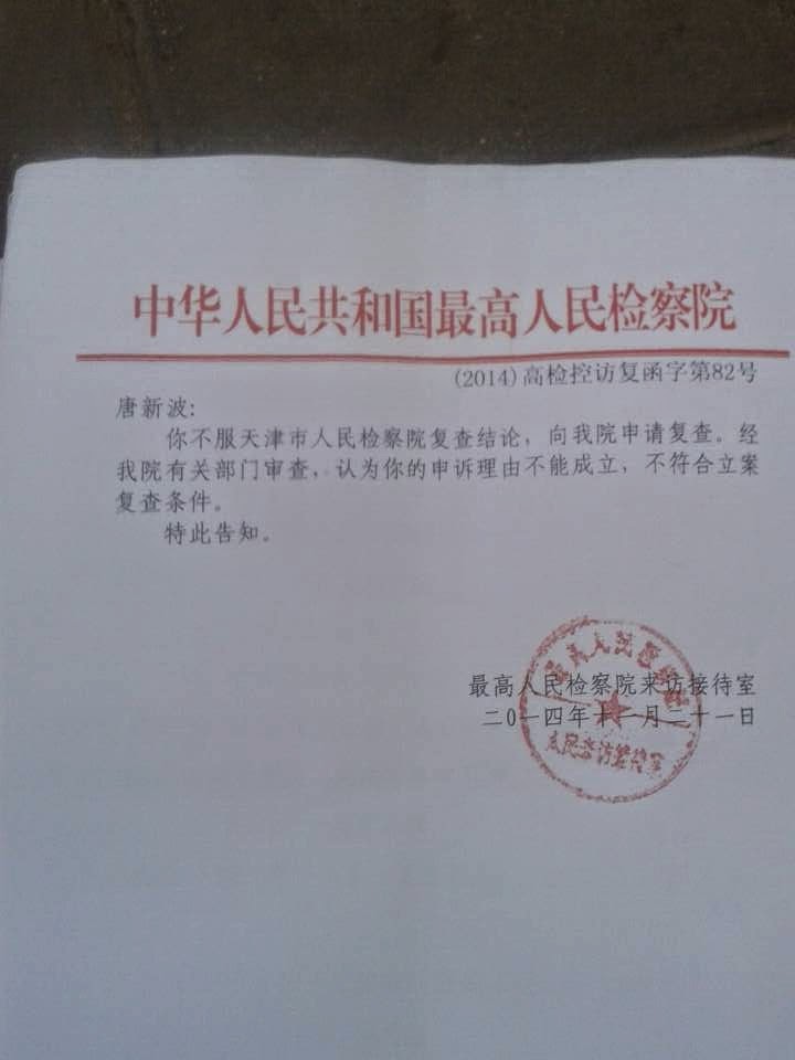 今天,访民歌唱团成员唐新波在望眼欲穿中终于拿到了最高人民检察院作出的【2014】高检访复函字第82号告知,彻底将唐新波为儿伸冤的希望破灭。拿到告知的唐新波说:这么多证人证言证明儿子不在2010年11月8日的凶杀案现场,但案子还是被最高检查院拍死了,是流血时候了……