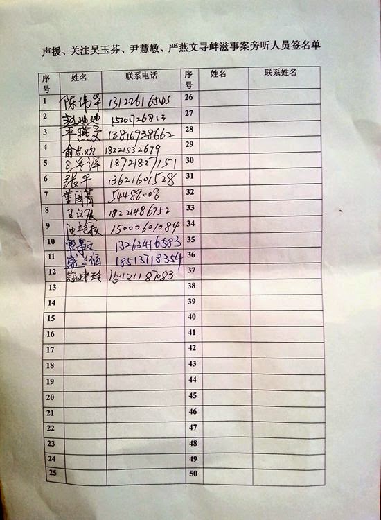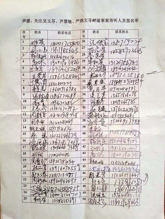 郑培培、虞春香、尹慧敏、颜兰英、吴玉芬、徐佩玲、石萍、谢金华、金妹珍等十多位维权者被当局指控2014年5月12日、13日“亚信峰会”前夕在西郊宾馆等附近拉:“亚信峰会成压信疯会,压信访压信仰压信息,请求习近平关注人权”等内容的横幅拍照,其内容发至境外敌对网站,造成很坏影响等等……。5月16日被抓捕,羁押至今已经有7个多月了。
