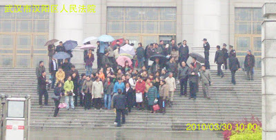 今天(3月30日)上午9时,原告周家东、晏有美、刘佳诉汉阳区公安违法行政一案在汉阳区人民法院三楼十二庭公开开庭。被告政法委书记兼公安局局长李国汉利用职权调动几十名警察把守庭外,阻止一百多人公民参加旁听,其庭内30多旁听座由法院安排公、捡、法家属坐满,将其一百多人阻止在距庭10m以外。