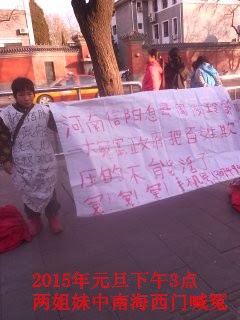 我两个年幼的孩子刘月凤、刘月红昨天201511日元旦下午3点左右,身穿状衣拉着横幅到中南海西门喊冤,至今下落不明。为了我的孩子学业不被耽误,还我的孩子重返校园,请中外媒体关注!