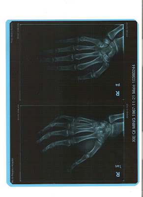 (爱克斯光片显示谢其明遭到北京安元鼎保安公司人员暴力后的手指骨折)