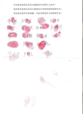 1月30日晚,我们一行18人被押上北京安元鼎保安公司的大客车,押送回无锡,随行有20多个保安,每个保安看管一人,我们相互之间被禁止说话,一人说话就被几个看押人员恐吓、谩骂。晚上车行至河北沧州高速公路休息站时,因多个保安在车内吸烟,我们18人中16个是妇女,她们已被呛得剧烈咳嗽,呼吸困难,要求保安不要再吸烟,但立即遭他们的谩骂,其中一个领队的胖子,身材非常高大壮实,动手殴打了妇女沈建群,前座的妇女王品仙责问那“胖子”为什么打人,没想到“胖子”转身就对王品仙劈头盖脸地一阵猛打,嘴里还不停地狂叫:“我让你们知道什么叫打人!”王品仙的脸上立即被打得破皮流血,眼眶乌黑,“胖子”不光在王品仙的头脸上狠打,见她年轻貌美,还对她胸部乱打乱抓,这发生在众目睽睽之下的恶行暴行,连随行的部分男女保安都看不过,也喊“胖子”不要打了。但“胖子”不听,继续欧打王品仙。这时无锡的谢其明上好厕所刚回到车上,见“胖子”殴打王品仙,对“胖子”说:“有事好好说,你不能打人啊。”“胖子”不说话回手就对谢其明脸上打了几拳,还叫其他2个保安一起欧打谢其明。后来在回途中“胖子”继续单独和带领其他保安对王品仙和谢其明暴力殴打,在车上继续对王品仙殴打了一次,对谢其明在车上继续殴打了2次,在车下又殴打了一次,致使谢其明右手指骨折(见医院诊断报告),造成永久伤害,他们2人当时伤痕累累,脸部乌青流血破相,以上事实由我们18人和车上20多个男女保安全程见证。