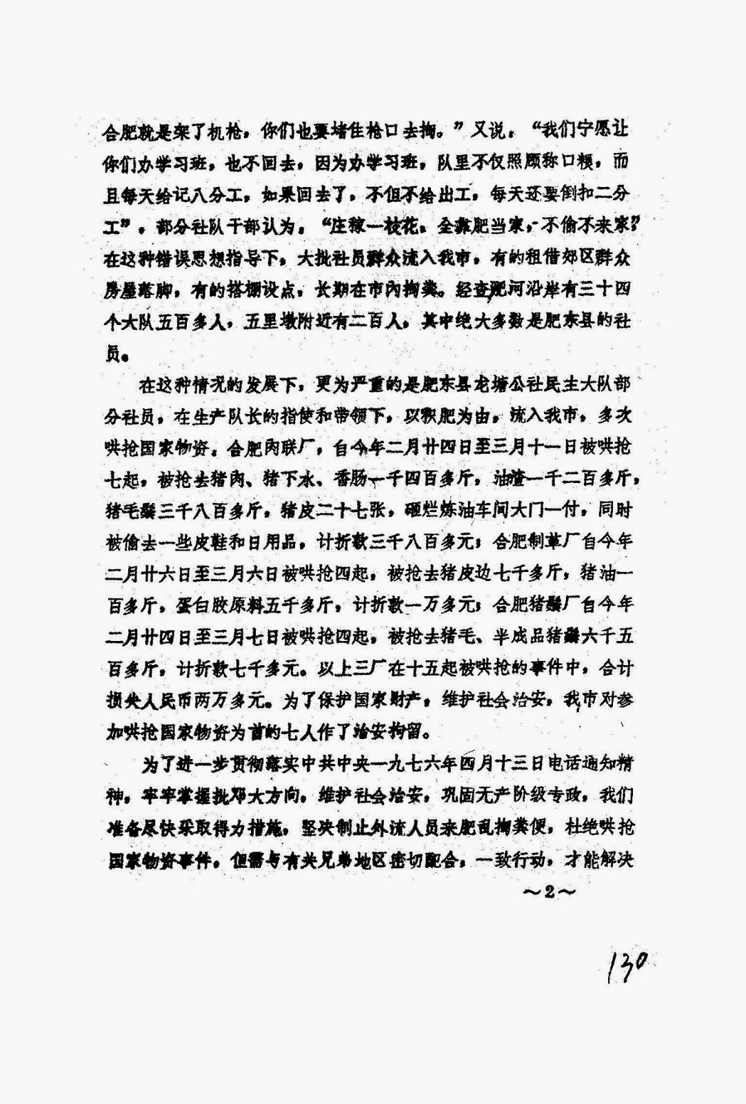二、请通知肥东县委按照中共中央四月十三日电话通知精神,严肃处理哄抢国家物资事件,负责追回全部物资。凡物资不在的必须折款赔偿,这样对治安拘留的龙塘公社民主大队七人可从宽处理,否则依法处理。