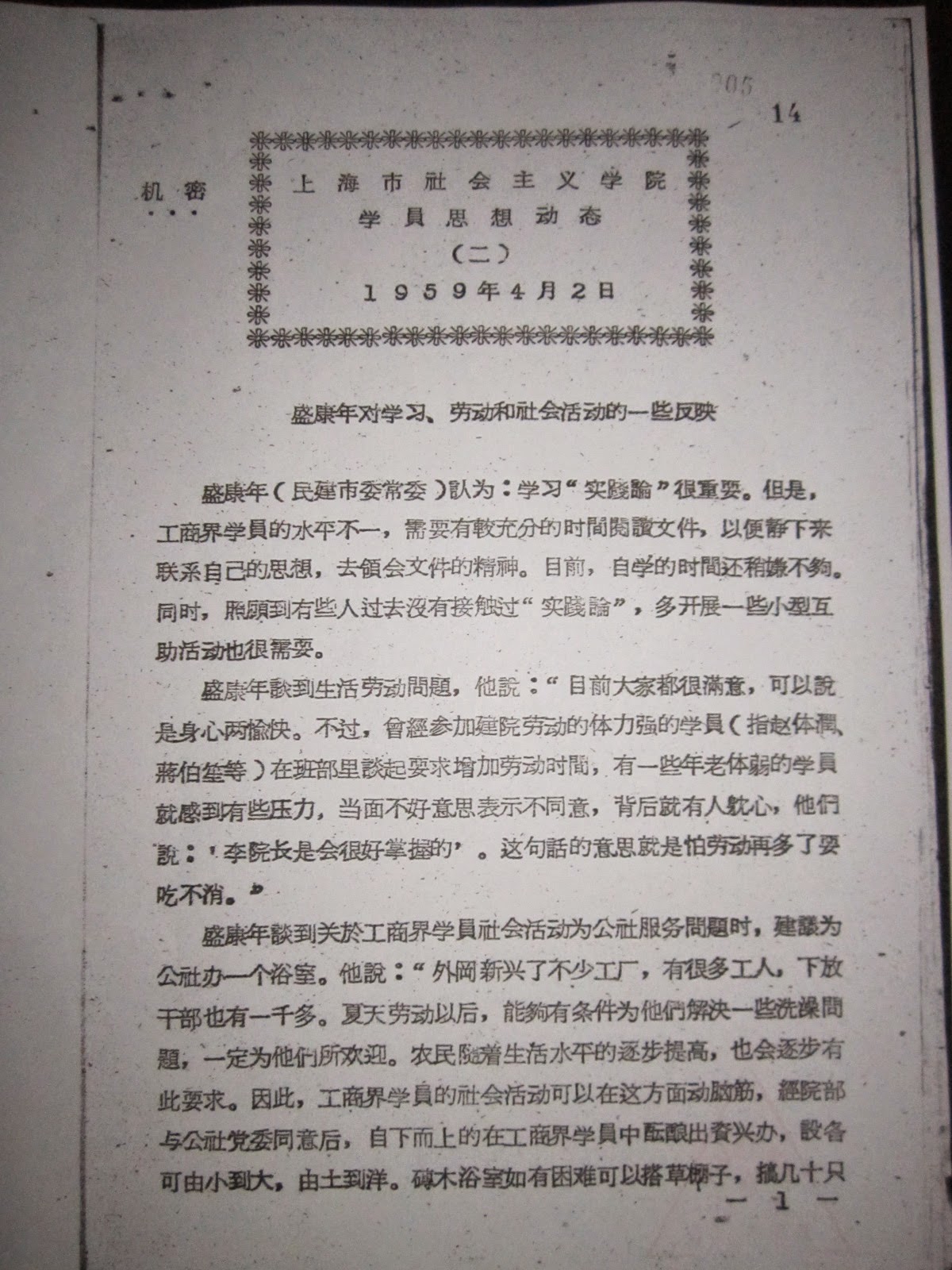 文件中提到的盛康年是上海工商界和荣毅仁齐名的“小开”,其父大商人盛丕华在中共建政后即担任上海市副市长直至去世(194911月至1961年初)。1957年反右运动中,荣毅仁和盛康年被打成“荣盛小集团”,只是经毛泽东干预后才侥幸未被打成右派。据说,此后盛就闷闷不乐,吃烂酒再加上原本就有胃病,最终在196510月因食道癌去世,年仅51岁。(见计泓赓,《荣毅仁与“荣盛小集团”的平反》,《百年潮》2006年第9期)