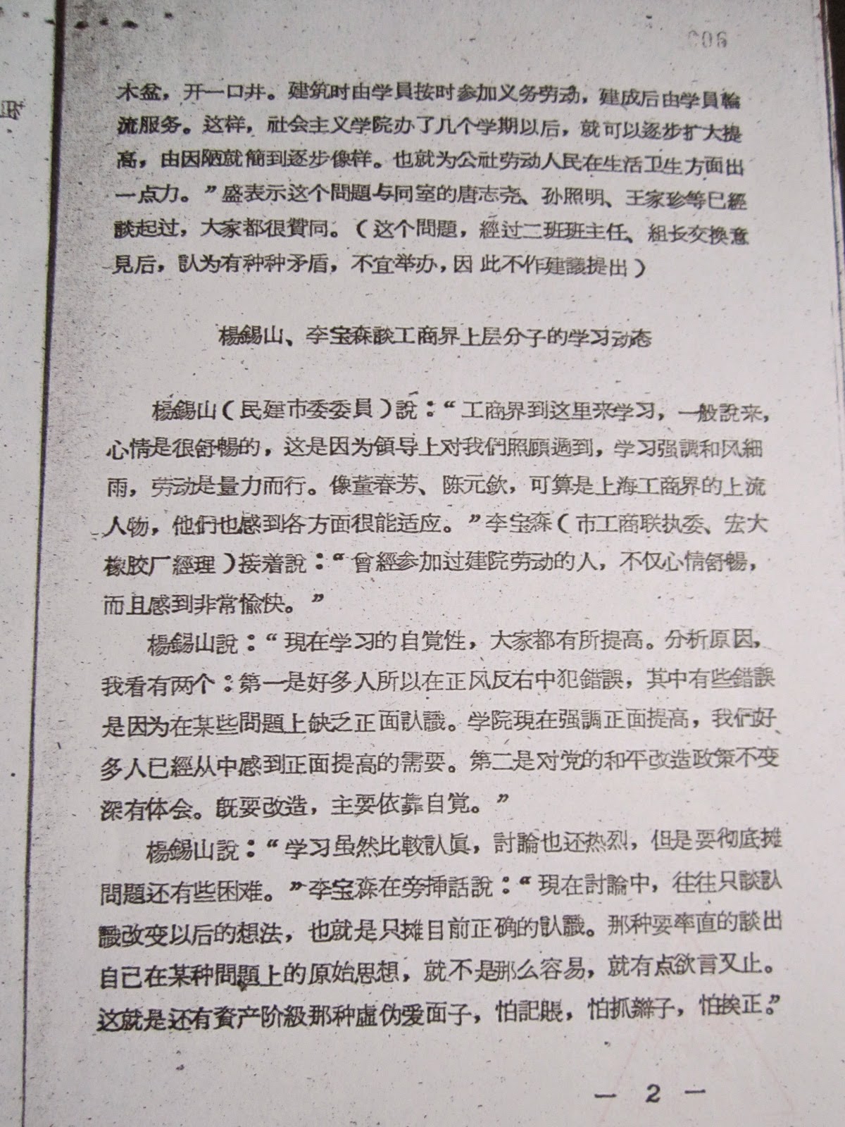 杨锡山(民建市委委员)说:“工商界到这里来学习,一般说来,心情是很舒畅的,这是因为领导上对我们照顾周到,学习强调和风细雨,劳动是量力而行。像董春芳、陈元钦,可算是上海工商界的上流人物,他们也感到各方面很能适应。”李宝森(市工商联执委、宏大橡胶厂经理)接着说:“曾经参加过建院劳动的人,不仅心情舒畅,而且感到非常愉快。”