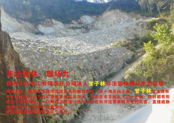 陕西天拓公司甘子林2012年1月至2012年7月13日之前未经林业部门许可,也未办理相关林地占用批准手续,也未经大同镇人民政府,也未经白路村村委同意,也未经我等七户受害者同意,天拓公司甘子林就使用大型机械和炸药爆破方式将张承稳、张承方、张承春、张承生、张承根、张承明、张宗善等七户1981年土地到户的承包林地成材林马尾松一次性毁掉51.3亩,至今天拓公司未作任何赔偿农民的损失,一直还在我村疯狂的毁林地,毁农用地,继续开矿。汉滨区林业局长杨佑金和林政股长陈友强,明知天拓公司在白路村和鱼姐村两村从2006年至2012年7月13日之前共毁掉用材林地近100亩,农用地20亩的犯罪事实后,杨佑金和陈友强等国家公职人员疯狂为天拓公司甘子林掩盖犯罪事实还继续为天拓公司甘子林批办林地手续,不去依法查办还多次派专人多次到陕西省林业厅为天拓公司在2013年1月份补办了林地占用合同书。
