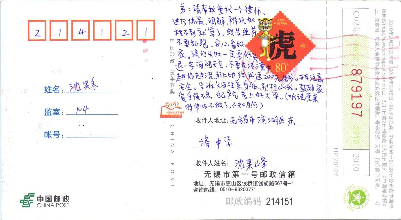 以沈果冬连续4次从看守所邮寄出的明信片内容看,当局以“妨害公务”对其刑事拘留的目的显然是逼迫其妻子和家人丁红芬放弃依法维权,接受不公平的拆迁安置“协议”。例如:沈果冬在第三封明信片上劝告妻子丁红芬:“不要乱跑、乱写……,我要不了3年……出门开车注意安全。”沈果冬在第四封给弟弟明信片上:“听说原来的律师不做了,重新找一个律师协商、调解、辩护,转告红芬不要乱跑,要安心……该低头时一定要低头……不要在泥潭中越陷越深……。”而且,这些明信片都能够出乎意料地及时到达沈果冬的家属手中。