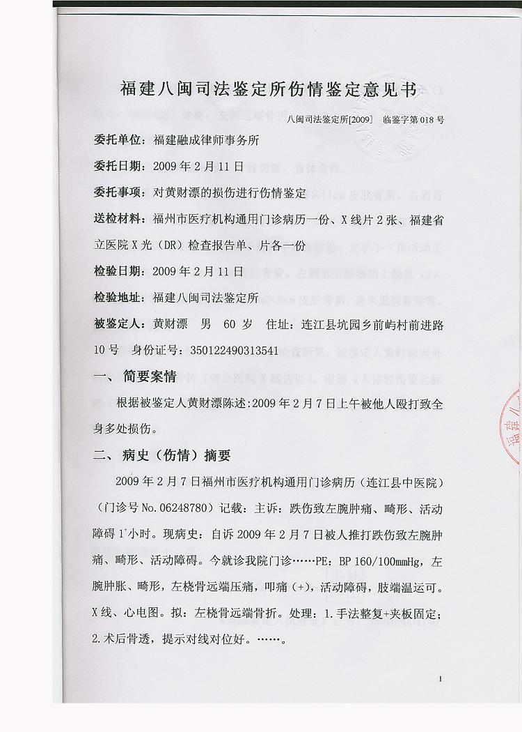 附连江县公安机关司法鉴定通知书和去年黄财漂受到暴力伤害后坑园镇派出所拒不作为而自费到八闽司法鉴定所做到司法鉴定书: