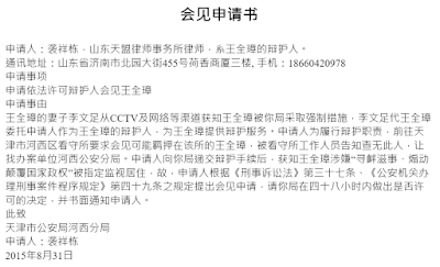 王全璋的妻子李文足从CCTV及网络等渠道获知王全璋被你局采取强制措施,李文足代王全璋委托申请人作为王全璋的辩护人,为王全璋提供辩护服务。申请人为履行辩护职责,前往天津市河西区看守所要求会见可能羁押在该所的王全璋,被看守所工作人员告知查无此人,让找办案单位河西公安分局。申请人向你局递交辩护手续后,获知王全璋涉嫌“寻衅滋事、煽动颠覆国家政权”被指定监视居住,故,申请人根据《刑事诉讼法》第三十七条、《公安机关办理刑事案件程序规定》第四十九条之规定提出会见申请,请你局在四十八小时内做出是否许可的决定,并书面通知申请人。