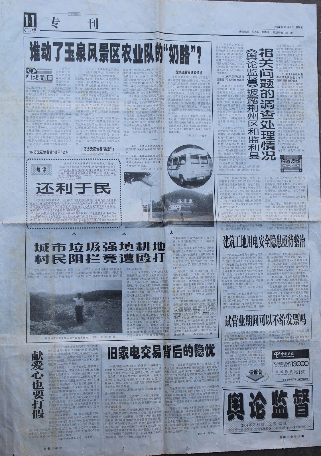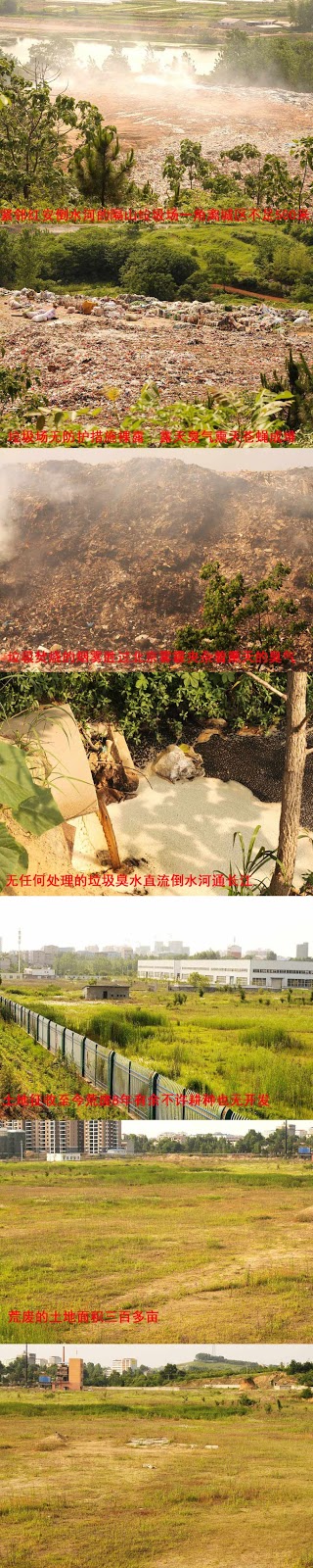 二、2004年7月份 ,他们带领100多不明身份的人,护着县垃圾车往隔山小组良田、良地倾倒,象日本人进攻中国大扫荡一样,把我们组的百姓打得鲜血直流,四处逃跑,我们村民上访到县政府、省政府,还刊登了湖北日报(2004年10月8日星期五,第C3版 ),可是至今这案子石沉大海,现在我们的生活环境污染得无法形容,污水直流大河到长江,牲畜不能喂养,大人小孩常年生病,百姓含恨度日如年,深恶痛绝。新垃圾场国家投资几千万元,但是至今不能倾倒。