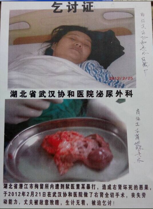 到潜江已经是13号的下午5点左右,没有把他们夫妻二人送回家直接送到离潜江市很远的郊外西大院,白鸯湖一私人的宾馆政府长期设的黑监狱多次关押过潜江访民,彭峰,伍立娟,黄行芝等还有独立选举专家姚立法都在此关押过。车子到庭院停下后已经有竹根滩派出所民警朱鹏在此等候,夫妻二人下车就被一群不认识的人守在一边,盲人关贤章还没有站稳就被看守的人一脚飞来直踹胸前当时关贤章后退几步倒地,此人再次又是几脚踹来,直击头部与胸部,已经处于昏迷状态,他们再次夺过盲人拐杖疯狂的殴打,肖伍艾看到老公快被打死,就拼命的高喊,与他们拼命保护盲人丈夫,却遭到更严重的殴打,一打手土匪一脚将肖伍艾踢出很远倒在地下起不来,这一帮打手才停止殴打。肖伍艾与关贤章被打昏迷后倒在地下,然后他们提起他们二人的衣领在地上拖行,一直拖到关押的黑监狱房间重重的摔在房间然后非法抢夺了他们的身份证与财物手机等东西。