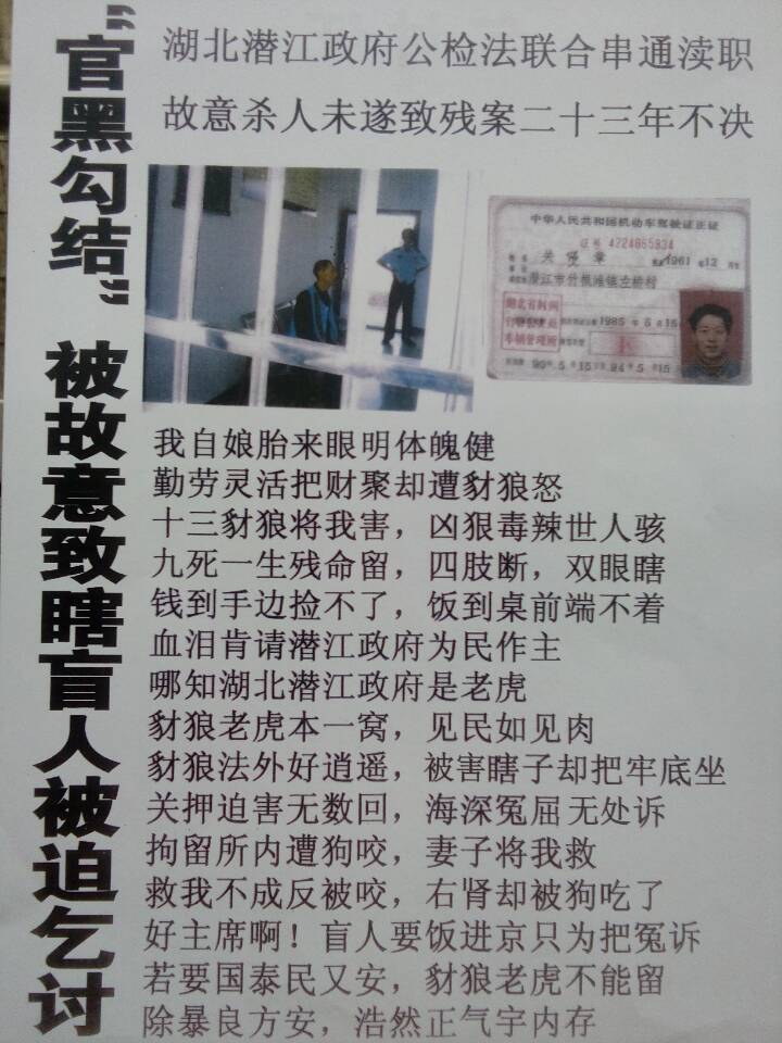关贤章与肖伍艾夫妻因为被害致盲一等一级重残,双目失明54岁,妻子肖伍艾被打致左肾功能坏死已经择出三级伤残患高血压,夫妻二人都是湖北潜江市竹根滩镇人,夫妻二人因为关贤章被害双目失明多次维权到乡,市,省等信访局维权都无任何结果。