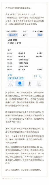 今天(8月31日)早上9点,一个18202543929的号码来电,告知其为天津市公安局,收到天津市检察院转办的法律监督函,向陈永福律师调查了解相关情况。