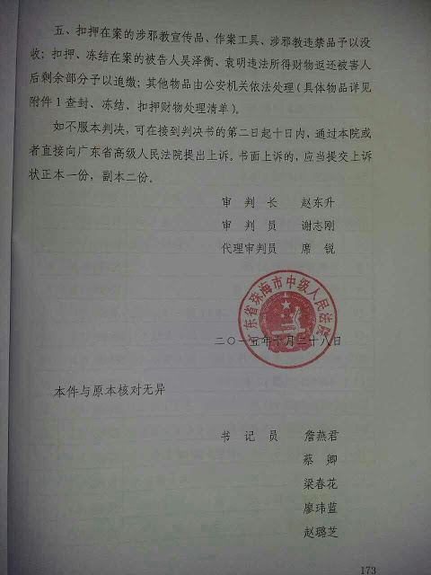 珠海“吴泽衡·华藏宗门”教案一审于今天10月30日在珠海中级人民法院宣判,吴泽衡被判无期徒刑,剥夺政治权利终身,并处罚金人民币七百一十五万元。同时于庭外静候结果的17名家属及弟子被当局以涉嫌扰乱社会治安被强行带至梅华派出所进行笔录,截至中午12时许宣判结束后才被释放。其中包括1名13岁的孩子,两名75岁老者,3名60岁的老者。同时身上有被抓打的痕迹。