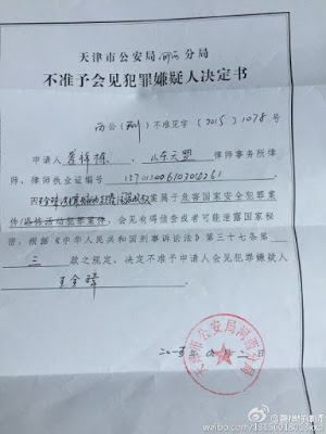 袭祥栋律师就为什么对王全璋案进行控告通报说:“我与李仲伟律师接受全璋爱人委托担任其辩护人,截至目前,两次会见申请,未被准许;两次要求了解案件情况,未给答复;两次致信全璋,是否转交不明;中秋全璋爱人邮寄的月饼被原封不动退回;全璋家属至今未接到指定监视居住通知。《刑事诉讼法》在此案中完全失灵,我们已提出控告。”