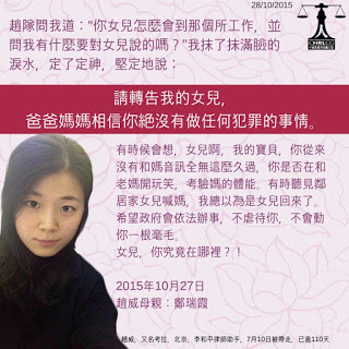 我的女儿赵威(考拉),在北京的住处被警方带走已经一百余天了,我至今没有收到任何部门的任何通知。由于长时间的思念与担忧,我们老两口都一病不起。眼看天气由凉转冷了,病得爬不起来的我决定爬不起来也要爬起来,去寻找我的女儿,给女儿送御寒的衣物。也正赶10月20日是女儿的24岁生日。基于此,10月19日晚,我从病床上爬起来,踏上了北上的列车,开始了寻女之旅。