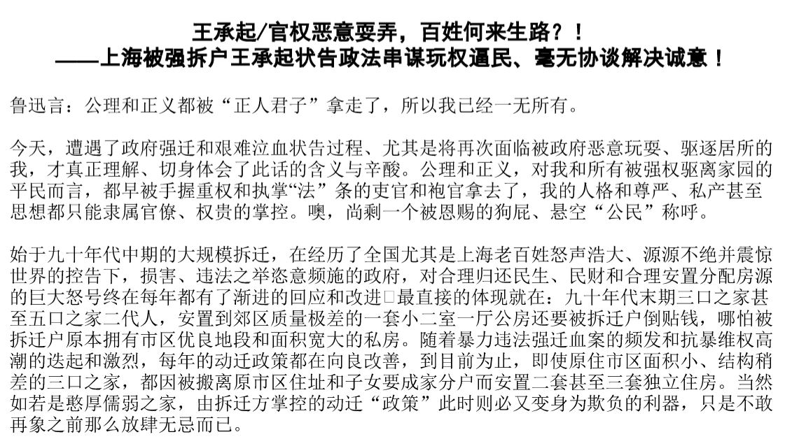 我户则不幸恰处于尚不规范、官权主导的拆迁之中,更不幸的是,为此我走上艰辛苦难的上访之路,而在上海,因官方违责追究的缺失,上访老案拖着不解决是极“正常”和普遍的。