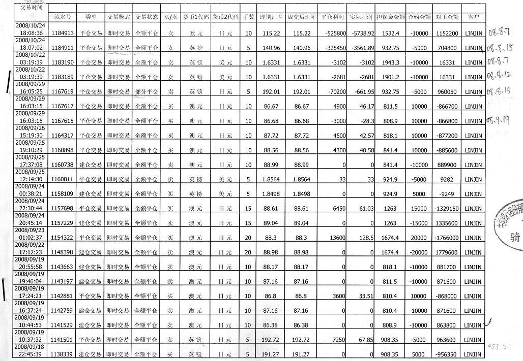 2009年11月24日,福州市台江区法院公开开庭审理。在法庭上,原告林瑞龙拿出中国银监会办公厅于2008年6月6日出台的银监办法[2008]第100号文件,该文件向各银监局、各政策性银行、国有商业银行、股份制商业银行以及邮储银行以特急形式下达通知,立即停止开办外汇保证金买卖交易业务,原来开办的业务只允许结清和平仓。各开办此业务的银行应当在接到通知的5日内,将已从事此项业务的客户数量、保证金总额、交易头寸总额、客户总体赢亏状况以及采取相应管理措施等,以书面形式一式两份报送银监会。此后每月初5日前将上月情况逐月报送,直到所有从事此业务的客户全部结清仓位为止。
