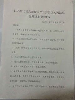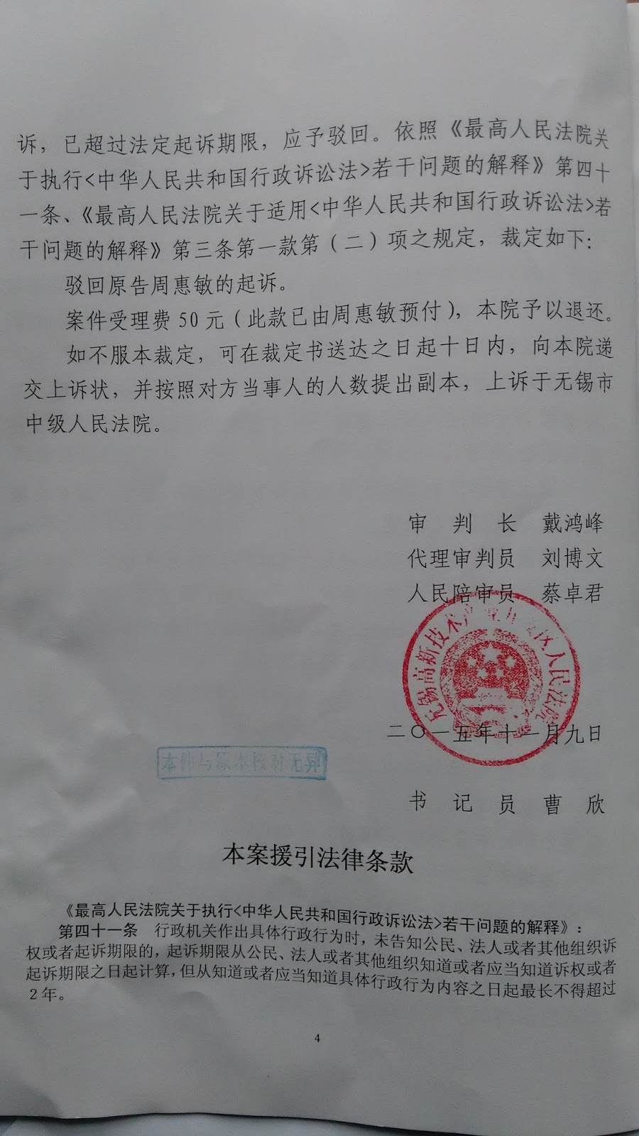 2015年11月10日,无锡新区访民周惠敏收到无锡高新技术产业开发区人民法院(新区法院)的《行政裁定书》,枉法以超过法定起诉期限为由,驳回了周惠敏的诉讼。