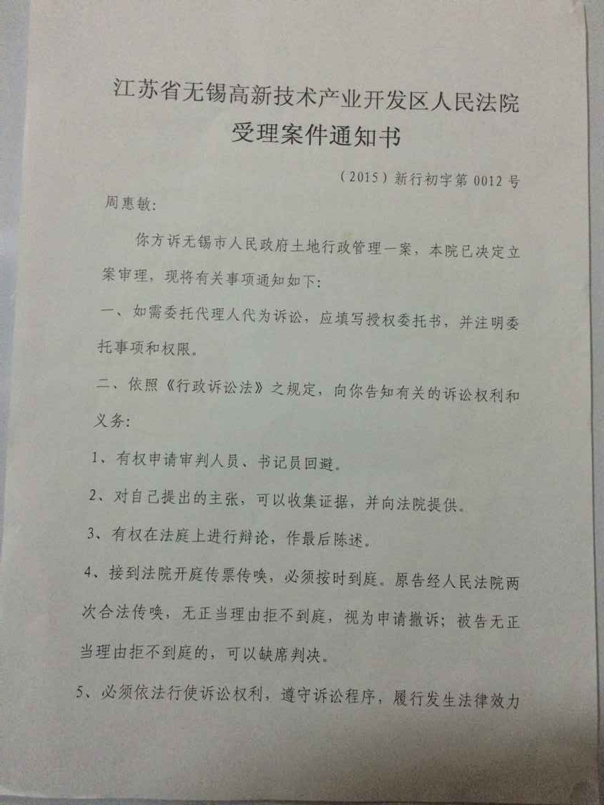 据周惠敏介绍,她在2015年2003年拆迁安置到了无锡新区长欣公寓的房产,当时土地性质为国有出让,2004年6月份她向无锡市国土局申请办理土地使用证,并交了费用,拿到了市国土局在2004年7月5日领证通知,但她在7月5日去领证时,国土局不给,直到2006年社区通知她去拿证,但土地使用性质已经由国有出让改变为国有划拨,为此,周惠敏不服,先先向无锡市南长区、新区和市中级人民法院提起诉讼,但都不受理。直到2015年5月,周惠敏到无锡市中级法院提起诉讼,中院魏巍法院要求周惠敏将被告改变为无锡市人民政府,然后中院指定到新区法院管辖。