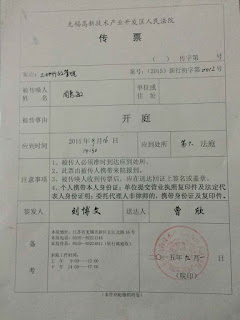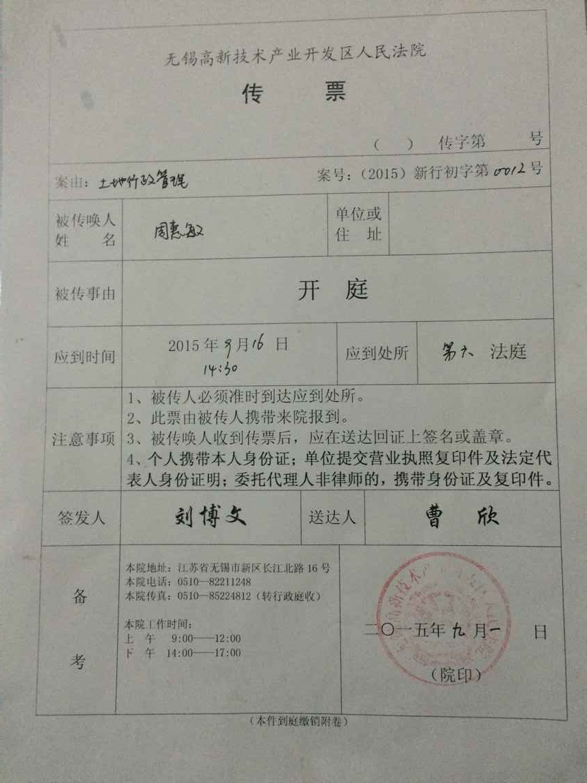 无锡新区法院于2015年6月30日受案,7月14日周惠敏交了诉讼费,9月1日法院发传票,通知9月16日开庭。