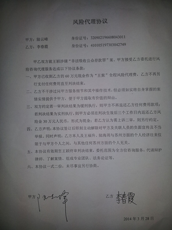 2016年1月12日下午一点半,李春霞诉江苏省盐城商会副会长陆云峰确认风险代理协议合同无效一案在姑苏区法院开庭,庭审中法官出示了从吴中公安分局调取的2014年11月24日吴中分局给陆云峰做的一份询问笔录,在该询问笔录里陆云峰承认和丁冬梅离婚后还在一起居住并一起做生意,陆云峰证实看到丁冬梅从后备箱里拿出两个黑色塑料袋内装60万,经吴中分局盖章确认真实的该笔录现保存在姑苏区法院的卷宗里,随时可以调取。这也印证了李春霞一直举报的苏州市吴中公安分局包庇罪犯,涉嫌在王颖非法吸收公众存款案里造假,苏州市姑苏区政协委员丁冬梅主动找到深圳升泽隆代表陆海周索贿60万,说是市里领导已经跟吴中分局领导说好把取保保证金500万减为300万,并索要60万好处费,保证王颖免于追究刑事责任。