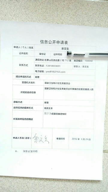 权利运动编辑员获悉2016年3月29日北京余文生律师正式向国家卫生计划生育委员会通过EMS快递的方式递交了信息公开申请,要求国家卫生计划生育委员会公开:所掌握的疫苗受害者人数,用于为疫苗受害者维权。