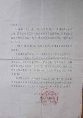 据正在北京替妻子喊冤的的彭金华说,这几年的损失超过70万,正是遭受如此巨大损失,且在地方上得不到解决的情况下,妻子周明述才于去年到北京信访。结果在北京上访被北京公安处以行政拘留9天后,被驻京办抓回石渠县关押。40天后,周明述被甘孜藏族自治州劳动教养委员会一事两罚,非法处以劳动教养两年。
