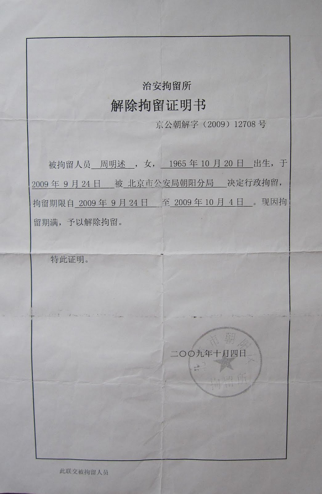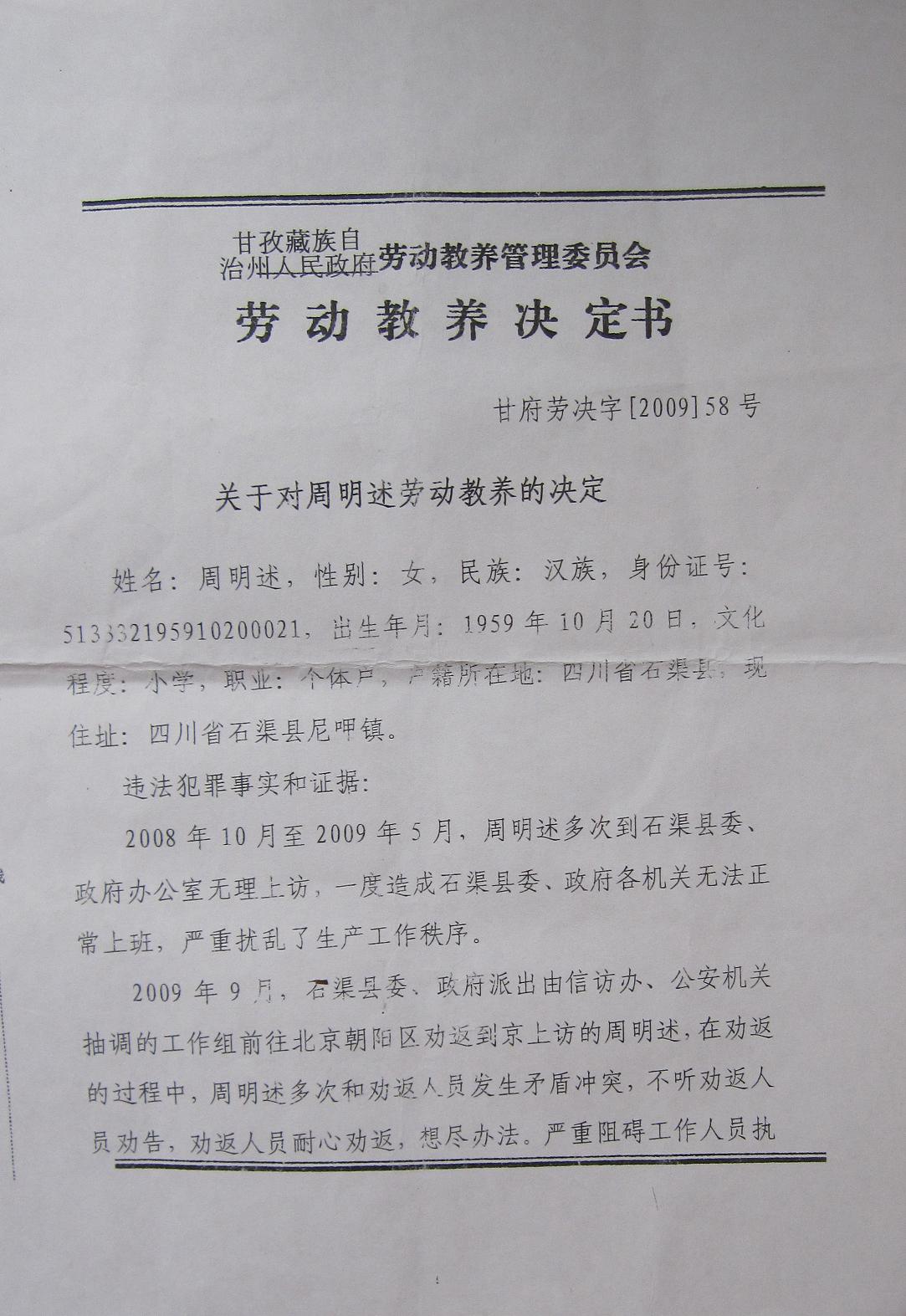 据正在北京替妻子喊冤的的彭金华说,这几年的损失超过70万,正是遭受如此巨大损失,且在地方上得不到解决的情况下,妻子周明述才于去年到北京信访。结果在北京上访被北京公安处以行政拘留9天后,被驻京办抓回石渠县关押。40天后,周明述被甘孜藏族自治州劳动教养委员会一事两罚,非法处以劳动教养两年。