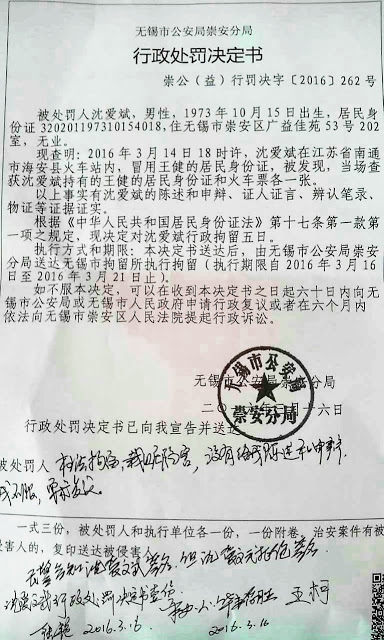 据陪同的朋友表示,当日在海安县火车站检票时沈爱斌已出示车票及证件进入2楼的候车区,但是在2楼的候车区被拦截带走,被带后海安县城北派出所时并没有为沈爱斌做笔录,也没有无锡公安的移交手续就马上对沈爱斌作出了行政处罚5天的决定。