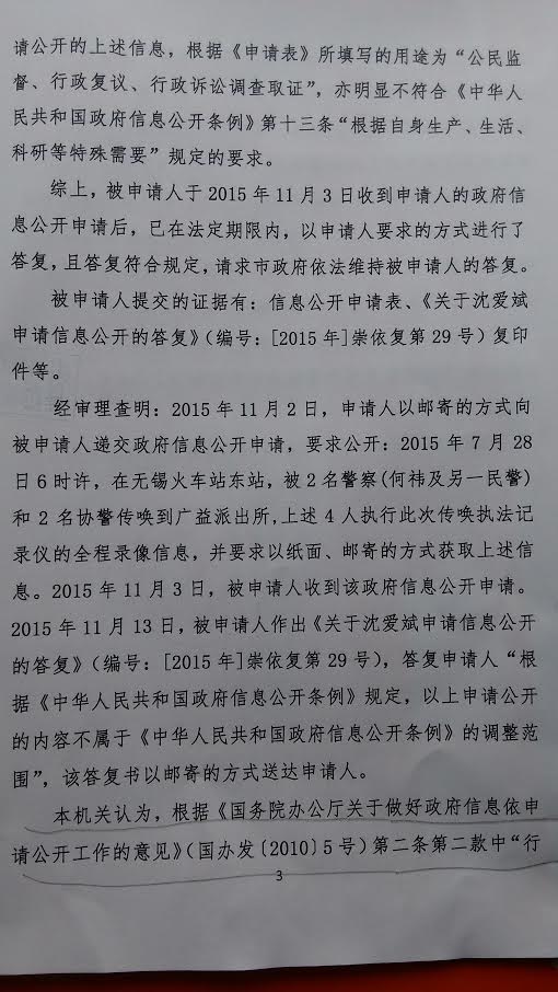 2016年3月5日权利运动编辑员获悉去年11月无锡沈爱斌向无锡市公安局崇安分局申请公开“2015年7月28日6时许,在无锡火车站东站被你局2名警察和2名协警传唤到广益派出所时上述4人执行此次传唤时佩戴执法记录仪的全程录像信息”,11月13日崇安公安分局作出“申请人申请公开的内容不属于《中华人民共和国政府信息公开条例》的调整范围”的答复。