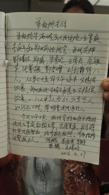 这时有位女法官走了过来,自称姓郑。苏楠立即上前问野大姐关在哪里了?看管妇女为什么没有女警?为什么不给饭吃不给水喝?郑法官说我们法官都没吃饭呢。苏楠说:“那老人家饿出个病怎么办?”郑法官说真有事我们有999急救车呢!我真是瞠目结舌!
