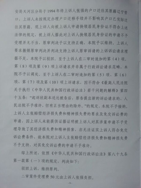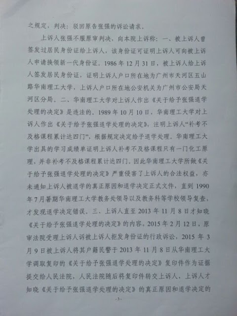 (2016年04月17日权利运动信息转载) 广州无户籍人士张强行政上诉,控告户口所在地公安机关广州市公安局天河区分局违法拒发身份证,广州市中级人民法院2015年11月19日《行政判决书》(2015)穗中法行终字第1406号审判长:朱琳 审判员:肖晓丽 代理审判员:姚伟 书记员:潘星钿、何杨妮 电话:83210575、83210569