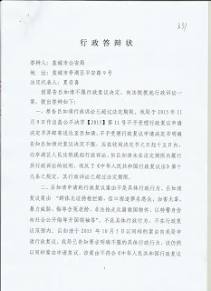 4、盐城市公安局【2015】第11号《不予受理行政复议申请决定书》。
