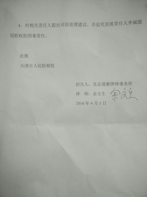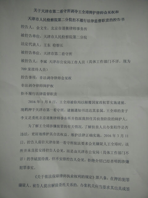 2016年04月06日权利运动编辑员获悉:羁押于天津市看守所的709律师案当事人王全璋律师目前仍无法被辩护律师会见,及当局拒绝介绍已经查明的涉嫌犯罪事实。日前余文生律向天津市人民检察院提交控告其非法剥夺律师会见及辩护权。要求立即采取措施纠正天津市公安局及其工作人员李斌的违法犯罪行为。