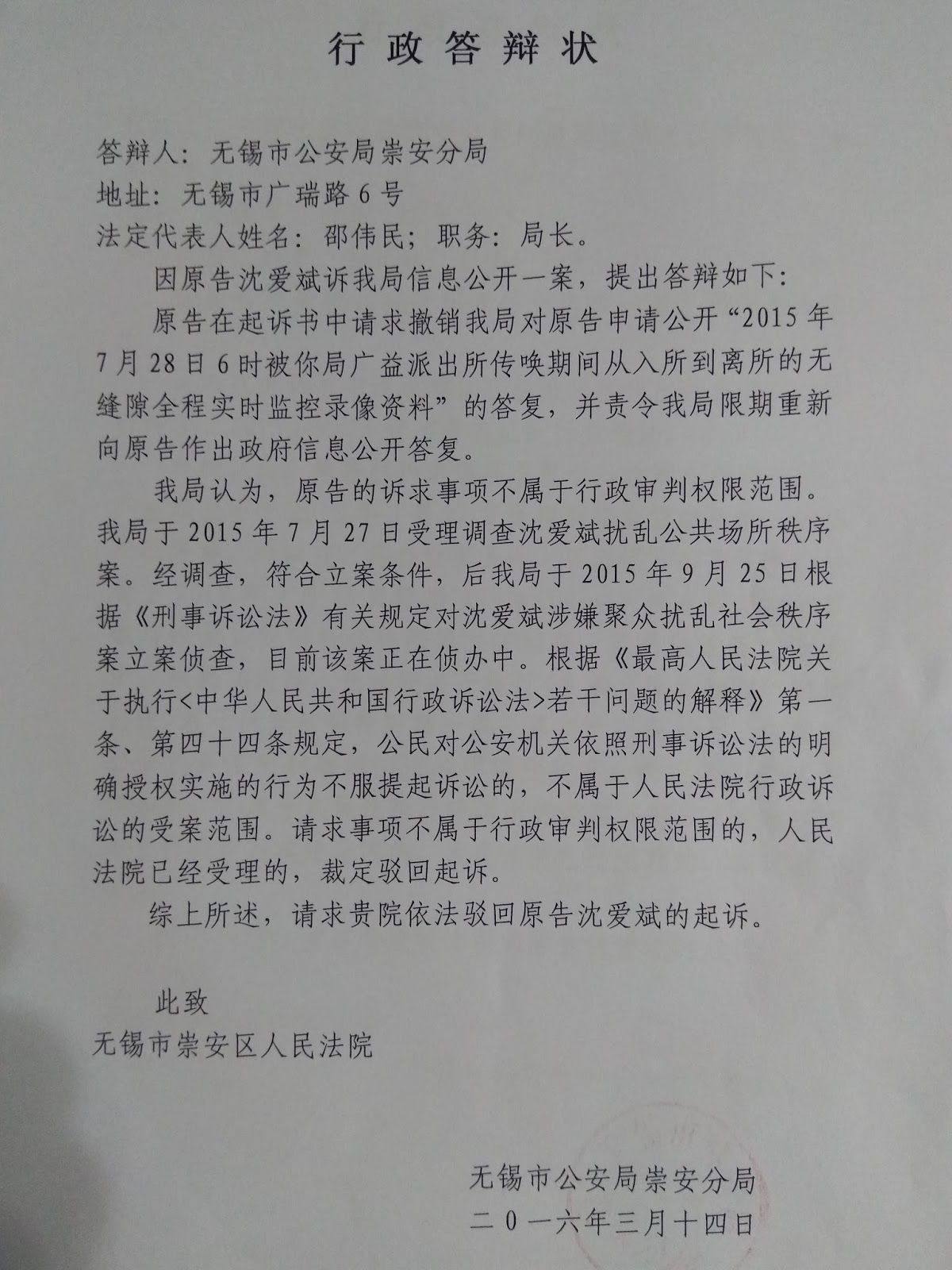 2016年4月3日权利运动编辑员获悉:2016年4月2日,无锡人权捍卫者沈爱斌收到无锡市崇安区人民法院邮寄送达的诉无锡市公安局崇安分局的6起行政案件的《行政答辩状》。从无锡市公安局崇安分局和广益派出所的答辩状中,沈爱斌看到了崇安公安分局在2015年9月25日就对其以“涉嫌聚众扰乱社会秩序罪”刑事立案,而在此期间,沈爱斌未收到崇安公安的任何告知和调查。