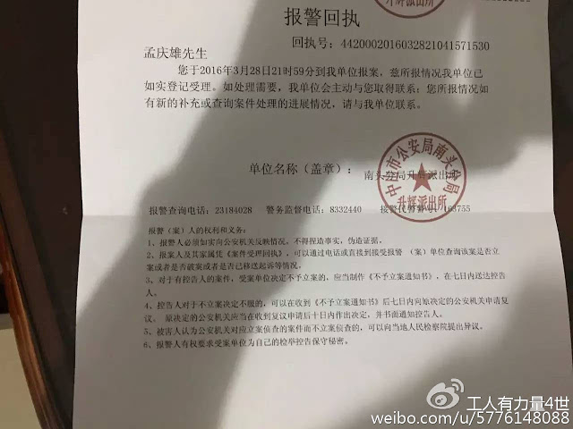 权利运动编辑员获悉2016年3月29日,被当局以“涉嫌聚众扰乱社会秩序”为由关押在看守所的工人领袖孟晗家人遭逼迁后又遭受多名暴徒持铁棍铁棒上门威胁。报警被敷衍了事,警察延迟出警,及派出所所长表示要求晗家人搬走。