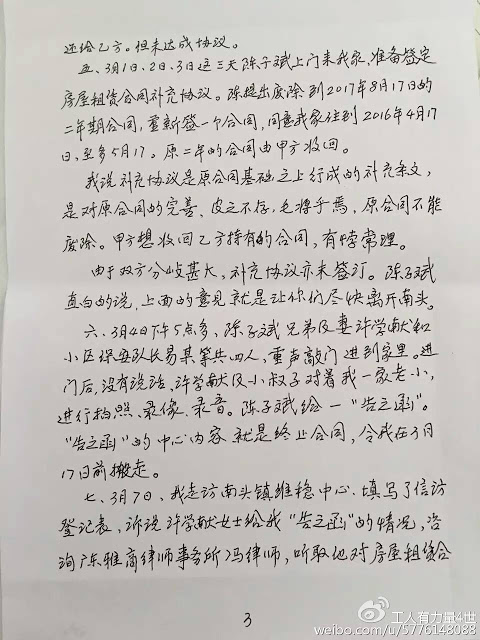 自孟晗12月3日被警察抓走以来,他的房东就开始不断骚扰孟晗家人,要求他们搬离,并称这是“上面的意见”。而实际上,孟晗家人与房东的房屋租赁合同是签到2017年的,现时房东单方面要求孟晗家人搬迁,既不合理,更不合法!从房东对孟晗家人的多次威胁、吵闹中可知,房东其实不过是充当了“上面”的打手而已,以此带给仍身处看守所却一直秉持良知、拒绝认罪的孟晗以更大的精神压力!