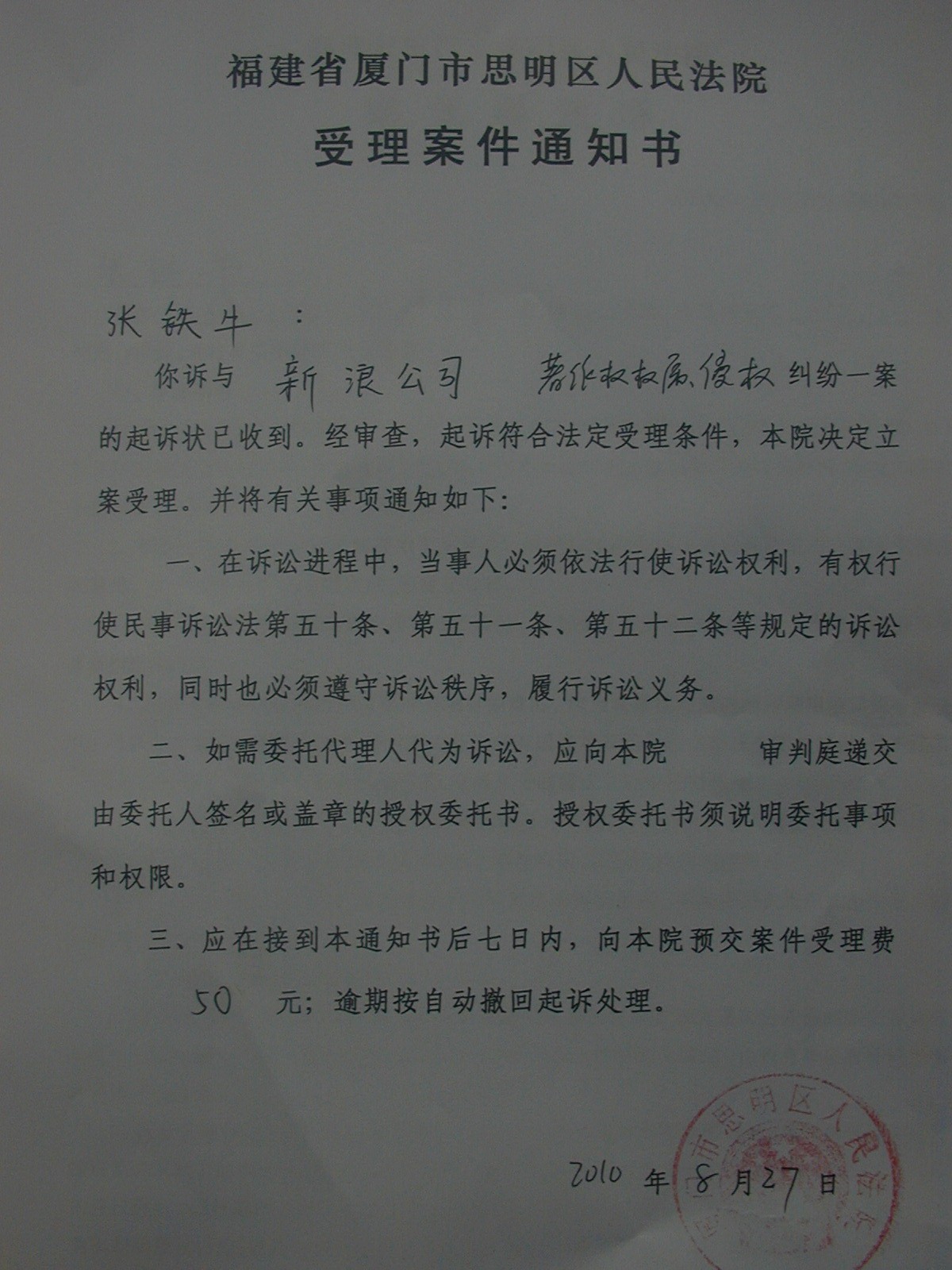 昨天,福建省厦门市维权人士张铁牛收到厦门市思明区法院通知,其状告国内门户网站新浪公司侵权的民事诉讼得到法院的正式受理。